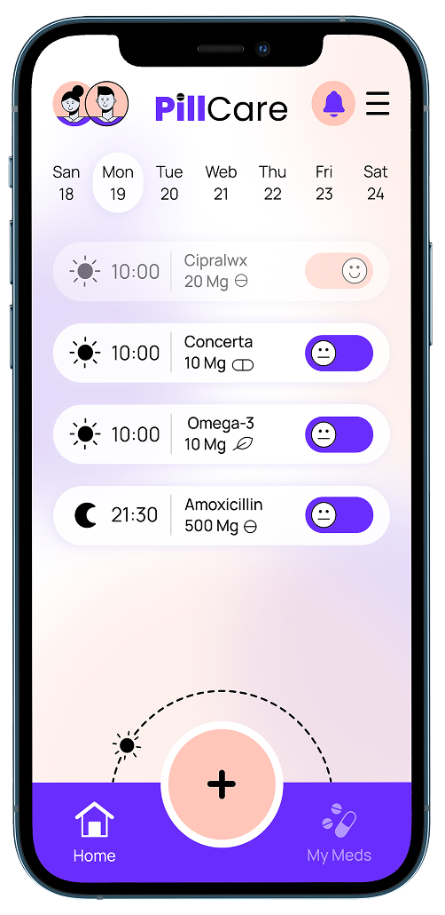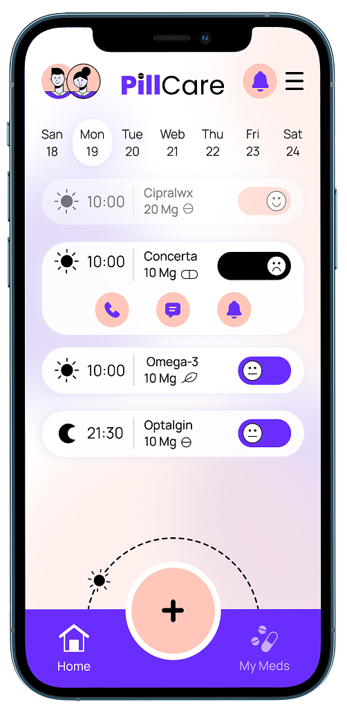 Pill Care is a mobile app designed to support daily medication routines in a calm, clear, and human way by combining practical medication management with emotional awareness and shared support.