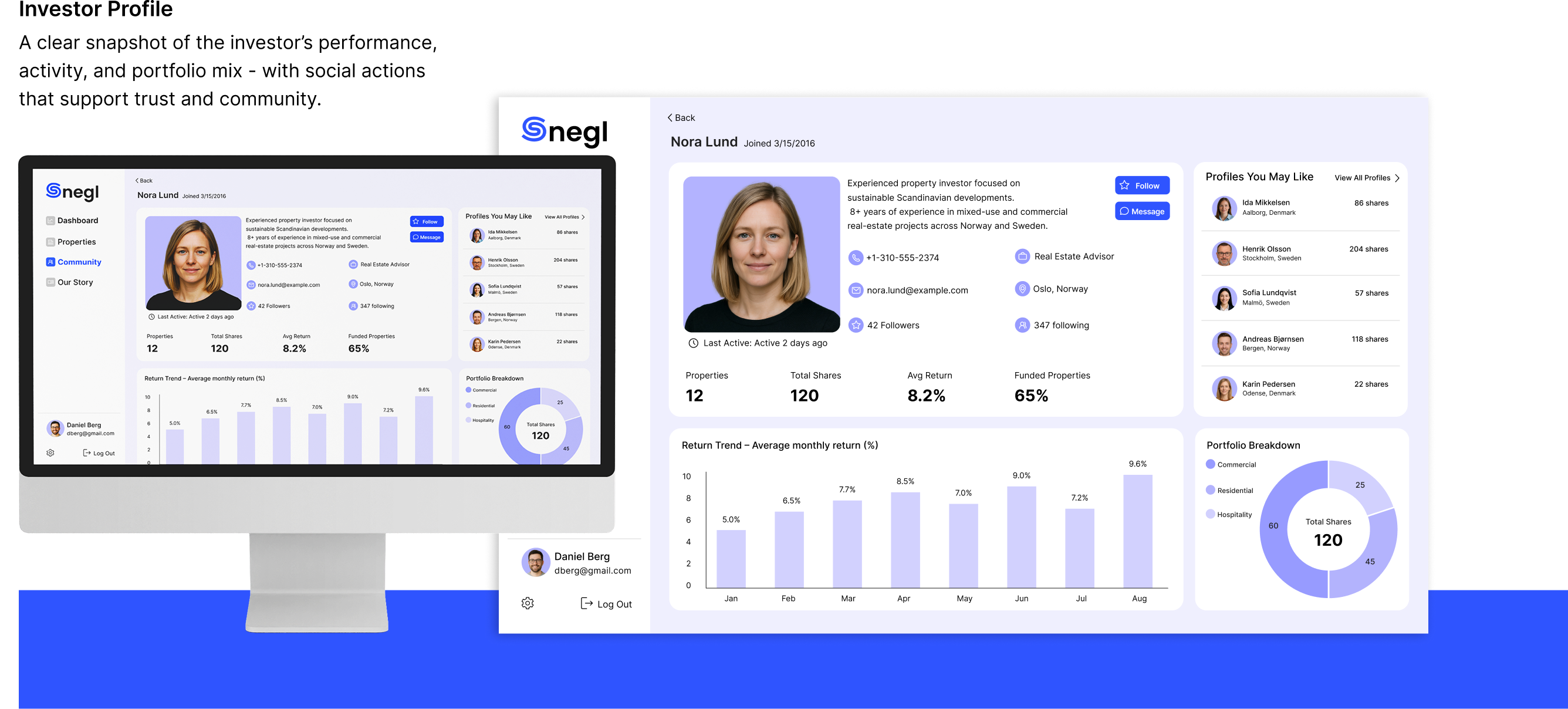 A clear snapshot of the investor’s performance, activity, and portfolio mix - with social actions that support trust and community.